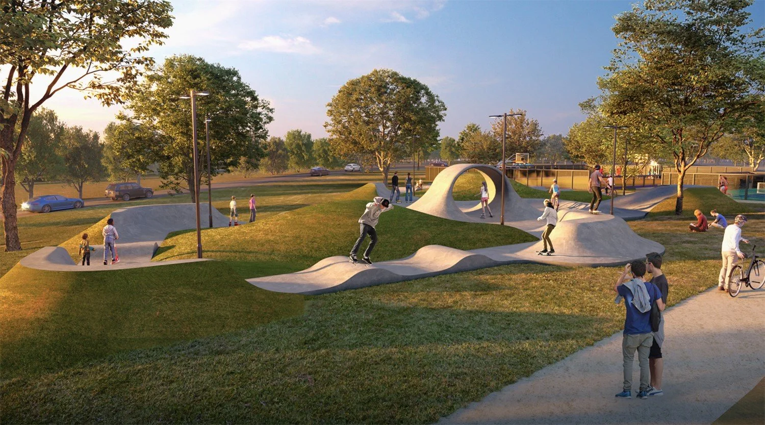 This skate dot is seamlessly integrated into a stormwater retention area, creating a sustainable hybrid space that serves both community and environmental needs. Designed for accessibility, the micro layout features mellow pump bumps, beginner-friendly ledges, and gradual quarter-pipe pockets, offering a safe and inviting introduction to new riders.