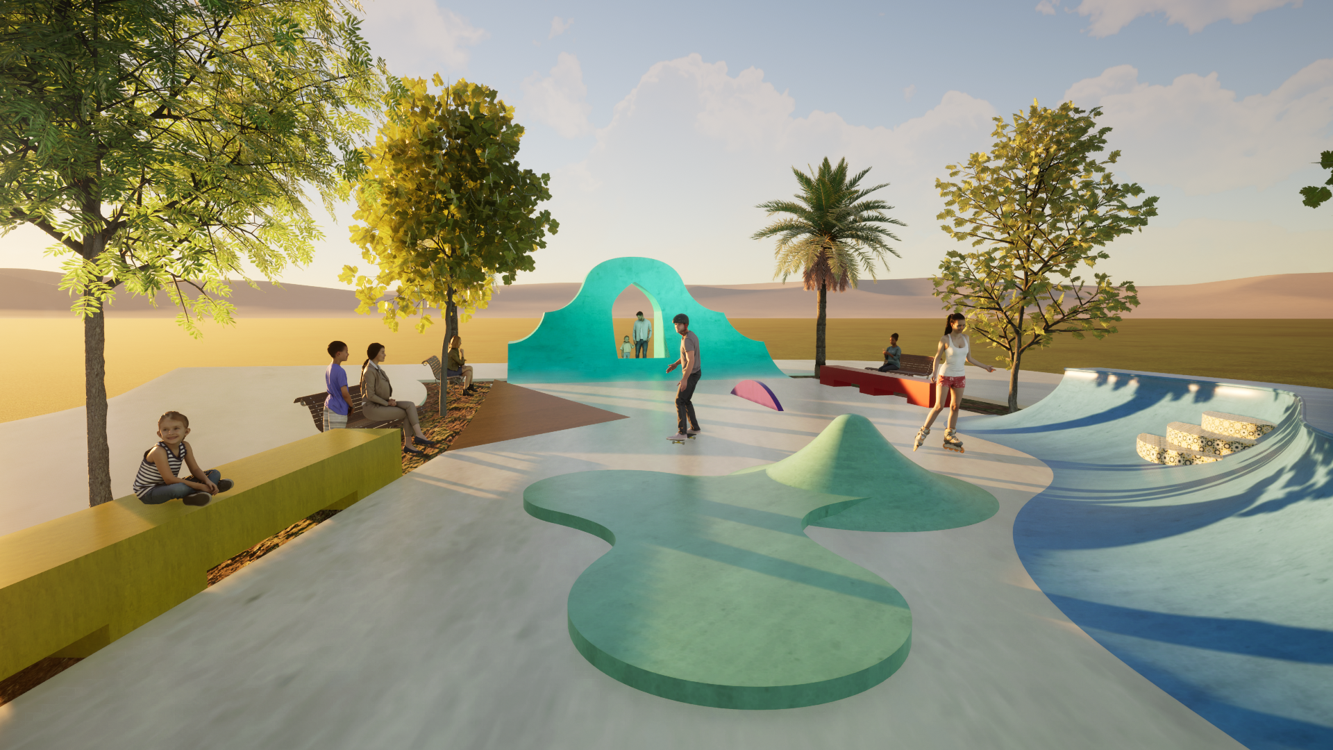 This next-generation skatepark offers riders an unforgettable experience, where lines weave over and under each other, creating moments of energy, flow, and connection. Inspired by the power of nature, the terrain shifts between the rush of cruising through a perfect ocean barrel and the surreal sensation of skating across the surface of the moon.